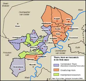 After the destruction of the Western Roman Empire there has been formed a shire, extending Kessnich, Thorn, Aldeneik and some other villages. Ansfried of Utrecht might have been the last count of this area, because in that period the shire suddenly fall apart. Finally, the area was divided into three parts; Thorn, Aldeneik and Kessenich. Thorn and Aldeneik became important abbeys, Kessenich was lying between both. So there was a major influence of those abbeys. Kessenich became an imperial free city, since the 14th century united with the county Bronshorn (Hunsel).