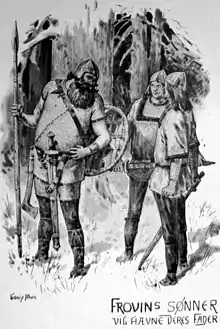 Ket and Wig appear in the Gesta Danorum as the sons of Frowin, the governor of Schleswig.[1] Wig also appears in the Anglo-Saxon Chronicle as the son of Freawine (Frowin) and father of Gewis, eponymous ancestor of the kingdom of Wessex and their kings,[2] but this is thought to be a late manipulation, inserting these heroes into a pedigree borrowed from a rival royal house, in which the Bernician eponym Bernic was replaced by the Wessex Gewis.
