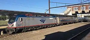 In the late 2020s and early 2030s, all equipment will be replaced with Amtrak Airo trainsets, the railroad's branding of its combination of Siemens Venture passenger cars and a Siemens Charger diesel-electric locomotive.[54] The trainsets for the Keystone Service will have six passenger cars, which will include a food service area and a mix of 2x2 coach class and 2x1 business class seating.[55] The car closest to the locomotive will be a specialized "Auxiliary Power Vehicle" which will include a pantograph to collect power from overhead lines and traction motors in the car and the locomotive.[56]
