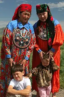 The names Khongorai and Khoorai were applied to the Khakas before they became known as the Khakas.[16][17][18][19] Khakas refer to themselves as Tadar.[20][21][22] Khoorai (Khorray) has also been in use to refer to them.[23][24][25] Now the Khakas call themselves Tadar[26][27] and do not use Khakas to describe themselves in their own language.[28] They are also called Abaka Tatars.[29]
