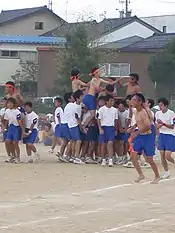 A similar Japanese game called kibasen (騎馬戦, literally "cavalry fight") is commonly played as part of an annual sports day event at elementary and junior high schools. It is a field event rather than a swimming event. In it, a team of four competitors work together, with three carrying the fourth, who wears a bandana (hachimaki) or hat. The team is defeated if they are knocked over or, more commonly, if their bandana/hat is removed by an opponent. Competitors are often divided into opposing red and white factions. In recent years some schools have removed physically demanding events such as the kibasen from sports day programs due to the risk of serious injury. In a 2003 incident a high school student in Fukuoka Prefecture was left quadriplegic after falling from his teammates' shoulders.[1]