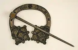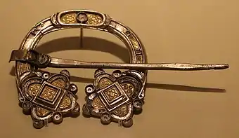 The Kilmainham Brooch is a late 8th- or early 9th-century Celtic brooch of the "penannular" type (i.e. its ring does not fully close or is incomplete). With a diameter of 9.67 cm, it is a relatively large example, and is made from silver, gold and glass, with filigree and interlace decorations. Like other high-quality brooches of its class, it was probably intended to fasten copes and other vestments rather than for everyday wear, as its precious metal content would have made it a status symbol for its owner;[2] less expensive Viking-style brooches were typically worn in pairs on women's clothing.[3][4]