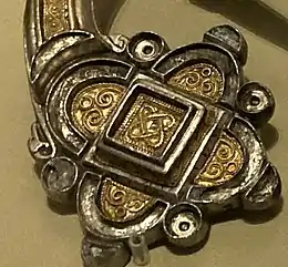 The brooch's style has been described as of "Ecclesia-Gothio character" with "fine workmanship", and compared to the Tara example although "not so fine".[10] Although described in 1989 as "probably Irish",[11] it contains structural and decorative designs, including its lobed (ie "hanging") terminals, small cusps, and the cartouche on the hoop, are reminiscent of the Pictish-syle, indicating that it may be of Northumbrian origin (unlikely), or at least heavily influenced by that style.[8][12][13]