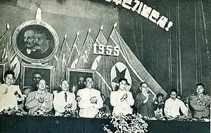 From left to right: Pak Chang-ok, Li Jishen, Kim Tu-bong, Zhu De, Kim Il-Sung, Averky Aristov, Pak Chŏng Ae, and Choe Yong-gon in 1955.