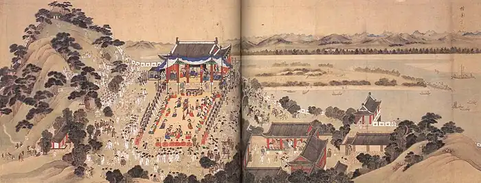 Towooart provides a short notice and an argumented selection of paintings.[8] The Korean Copyright Commission lists 757 paintings, 7 calligraphies and 4 moldings for Kim Hong-do.[9] Some paintings have multiple descriptions: often a sepia version is given with a very fine resolution, and a colorful one with a lower resolution. An example is "Feast for the Pyongyang Governor" (평양감사 향안도).
