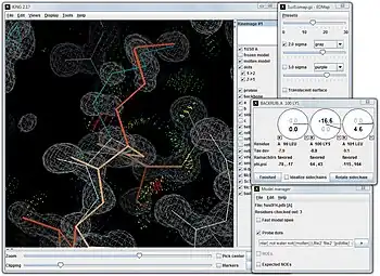 KiNG is an open-source kinemage viewer, written in the programming language Java by Ian Davis and Vincent Chen,[18] that can work interactively either standalone on a user machine with no network connection, or as a web service in a web page. The interactive nature of kinemages is their primary purpose and attribute. To appreciate their nature, the demonstration KiNG in browser has two examples that can be moved around in 3D, plus instructions for how to embed a kinemage on a web page.[19] The figure below shows KiNG being used to remodel a lysine sidechain in a high-resolution crystal structure. KiNG is one of the viewers provided on each structure page at the Protein Data Bank site,[20] and displays validation results in 3D on the MolProbity site.[21][22][23] Kinemages can also be shown in immersive virtual reality systems, with the open-source KinImmerse software.[24] All of the kinemage display and all-atom contact software is available free and open-source on the kinemage web site.
