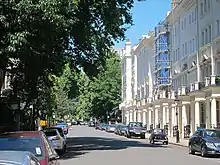 The Kingston House estate and Ennismore Gardens in Knightsbridge is a green, dual-character area within the western limits of the City of Westminster in London. The first-named is immediately south of Hyde Park, London taking up the park's semi-panorama row of 8 to 13 Princes Gate (demolished) and otherwise, as to more of its wings, set around the east of Princes Gate Garden including a terrace of houses №s 1 to 7 Bolney Gate. The second-named is a garden square of 59 tall creamy-white terraced houses and the approach road to Prince of Wales Gate, Hyde Park[lower-alpha 1] as well as the identical-size public, square green of the church that is since 1956 the Russian Orthodox Cathedral of the Dormition of the Mother of God and All Saints facing which green are its anomalous outlier row for a London garden square, №s 61 to 66.[lower-alpha 2] The relatively small, broad-fronted house set against the Consulate-used pairing at №s 61 to 62 is № 60 and as with the other 65 numbers of Ennismore Gardens is a listed building.