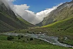The hydronym Kistinka derives from one of the old Ingush ethnonyms — Kisti,[2][3][4][5][6][7] and is used to refer to both rivers Arm-khi (Ingush: Ӏарам-хий, romanized: Aram-khi; Georgian: ქისტეთისწყალი, Kistetis-tskali)[8] in the Dzheyrakhsky District and Oakhkara-khi (Georgian: ხდე, ქისტურა, romanized: khde, kist'ura) in the Kazbegi Municipality.[9] In 1910, Foma Gorepekin composes a short guide titled: «In the mountains of the Terek region», where he mentions being escorted along the gorge of the river Kistinka by the Buzurtanov brothers — well-known local guides and alpinists from the neighbouring Ingush village Gveleti.[10]