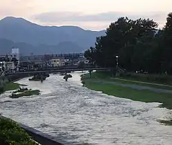 The Kitakami River (北上川, Kitakami-gawa) is the fourth largest river in Japan and the largest in the Tōhoku region. It is 249 kilometres (155 mi) long and drains an area of 10,150 square kilometres (3,920 sq mi).[1] It flows through mostly rural areas of Iwate and Miyagi Prefectures. The source of the river is the Mount Nanashigure in northern Iwate, from which it flows to the south between the Kitakami Mountains and the Ōu Mountains.[1] The river is unusual in that it has two mouths, one flowing south into Ishinomaki Bay and the other flowing east into the Pacific Ocean, both in Ishinomaki City.