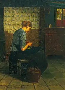 Dutch painting of a young kitchen maid. 19th century or early 20th century.