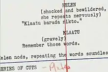Script page of The Day the Earth Stood Still (1951) showing the phrase