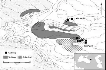 Klin-Yar (or Klin-Jar) is a prehistoric and early medieval site in the North Caucasus, outside of Kislovodsk. It was first discovered in the 1980s. Archaeological excavations had uncovered settlement traces and extensive cemetery areas starting in the 8th century BC, belonging to the Koban culture. The site was used up to the 7th century AD. Its long use over all this period, its size and rich finds, as well as the data quality of recent excavations make Klin-Yar one of the most important archaeological sites of the region.