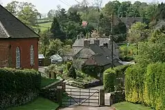 The church in Kniveton was originally a chapelry to St Oswald's church in Ashbourne.[5] St Michael and All Angels' Church has Norman origins as evidenced in the plain semi-circular arch of the porch. It is on a small hill and built of coursed rubble gritstone with ashlar dressings in the Early English style. It dates from the 13th century and consists of chancel, nave, south porch and a low embattled western tower with a short spire. The tower has two 17th-century bells, one dated 1665.[5][9][10] St Michael's Church is a Grade I listed building.[11]