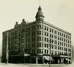 The Knutsford Hotel was built in downtown Salt Lake City in 1891.[4] The architects were the Omaha-based firm of Mendelssohn, Fisher and Lawrie.[4] The general contractors, also from Omaha, were Rocheford & Gould. The hotel was a 132-foot-by-132-foot Victorian-influenced structure built primarily of granite at a cost of $750,000.[4] The hotel had 250 rooms[4] and was advertised as being completely fireproof.[5] The hotel's unique name was in honor of the owner's birthplace in Knutsford, Cheshire, England.[6] Gustavus S. Holmes was a one-time owner and operator of The Knutsford.[7] Holmes also owned The Angelus in Los Angeles, California and would often advertise the hotels together.[5] In 1912, The Knutsford was remodeled and converted into The Auerbach department store.[1][8] The building housed the Sears Roebuck company's department store from 1928 to 1933.[9]