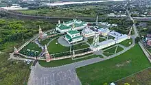 Like some other ancient Russian cities, it has a kremlin, which is a citadel similar to the more famous one in Moscow and also built of red brick.[13] The stone Kolomna Kremlin was built from 1525–1531 under the Russian Tsar Vasily III. The Kolomna citadel was a part of the Great Abatis Border[14] and, although much of the surrounding wall was removed in the eighteenth century and materials used to construct other public buildings, the remaining stretch of wall, several towers, and some interior buildings have been preserved and held in good shape with a museum located inside. In front of the façade stands a statue of Dmitry Donskoy, celebrating the gathering of his troops in Kolomna prior to the Battle of Kulikovo in 1380.