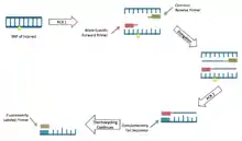 There are three components that are critical to the KASP assay: 1) a purified DNA sample, 2) two allele-specific forward primers, and 3) a common reverse primer. A minimum of 5-10 ng of the extracted DNA sample is required for the method to function properly. The DNA sample is purified by adding a mixture of chemicals to the buffer solution.[2] In the first round of PCR, a KASP primer mix that contains the two allele-specific forward primers and the single reverse primer is added to the mixture. The specific nature of the forward primers allows for the primer to bind solely at the SNP of interest, allowing DNA polymerase to lay down the rest of the complementary nucleotides. During this time, the common reverse primer begins to lay down complementary nucleotides on the opposite strand of DNA. This ends the first round of PCR.[2]
