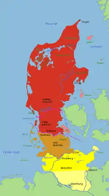 Historically, the watercourse has been the administrative border between regions to the north and south. In the Middle Ages it was called Skodborg Å after the royal castle Skodborghus, where a track crossed the watercourse south of Vejen.[3] For centuries a customs border near the Kongeå separated the Kingdom of Denmark from the duchy of Schleswig. From 1864 to 1920, except in the extreme west, the Kongeåen marked the border between Denmark and Germany.[2]