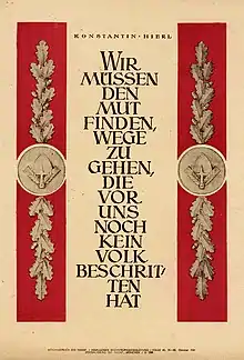 Hierl was already a high-ranking member of the NSDAP when the Party took power in January 1933. He remained the head of the labour organization - now called the Nationalsozialistischer Arbeitsdienst, or NSAD. Adolf Hitler named him as State Secretary in the Reich Ministry of Labour under Franz Seldte, with the order to build up a powerful labour service organization.[1] Facing Minister Seldte's resistance, Hierl in 1934 switched to the Reich Ministry of the Interior under Wilhelm Frick in the rank of a Reichskommissar. Hierl was also named a member of Hans Frank's Academy for German Law.[2] On 11 July 1934, the NSAD was renamed Reichsarbeitsdienst or RAD (Reich Labor Service) which Hierl would control as its chief until the end of World War II. The Reich Labor Service was divided into two major sections, one for men (Reichsarbeitsdienst Männer - RAD/M) and one for women (Reichsarbeitdienst der weiblichen Jugend - RAD/wJ). The RAD was composed of 40 Gau-sections (Arbeitsgau). In 1936 the Reich Labor Service built the model village of Hierlshagen (present-day Ostaszów in Poland), named after Hierl. He was named Reich Labor Leader (Reichsarbeitsführer) in 1935 and Reichsleiter, the second highest political rank in the Nazi Party, on 10 September 1936.[1][3] Also in 1936, he was awarded the Golden Party Badge. Hierl was further appointed Minister Without Portfolio in 1943.[1]