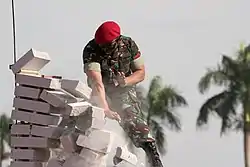 Group 1 Para Commandos (Grup 1 Para Komando) is a unit of Brigade level which is part of the Army Special Forces Command and was established on 23 March 1963. The group was first commanded by Major L.B. Moerdani. The unit's motto known as Dhuaja is Eka Wastu Baladhika,[15] then created by Corporal Suyanto. It has a total of 3,274 personnel.[16] The unit's internal organization consists of the group headquarters and four battalions which are: