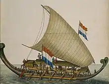 It is approximately ten metres long and very narrow,[7] quite open, very low, and weighs about four tons.[8] It had outriggers of bamboo about five feet off each side, which supported a bamboo platform extending the whole length of the vessel.[8] On the extreme outside of this sit the twenty rowers (overall it needs 40 paddlers),[8][9] while within was a convenient passage fore and aft. The middle portion of the boat is covered with a thatch-house, in which baggage and passengers are stowed. The gunwale is not more than a foot above water, and suffer the great top and side weight.[8]