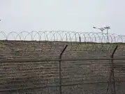 A 2007 Reuters report revealed that there is no coast to coast wall located across the DMZ and that the pictures of a "wall" which have been used in North Korean propaganda have merely been pictures of concrete anti-tank barriers.[35] While 800,000 landmines were being removed in 2018, it was shown that the Joint Security Area along the Korean border was guarded by standard barbed wire.[36]