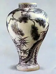 Simplified designs emerged early on. Buddhist designs still prevailed in celadon wares: lotus flowers, and willow trees. The form most often seen was that of pear-shaped bottles. Notable were thinner glazes, and colourless glazes for buncheong or stoneware. During the Joseon period, Koreans applied the sanggam tradition to create buncheong ceramics.[18][19] In contrast to the refined elegance of Goryeo celadon, buncheong is painted stoneware designed to be natural, unassuming, and practical.[20] However, the buncheong tradition was gradually replaced by Joseon white porcelain, its aristocratic counterpart, and disappeared in Korea by the end of the 16th century.[19] Buncheong became known and prized in Japan as Mishima.[21][22][23]