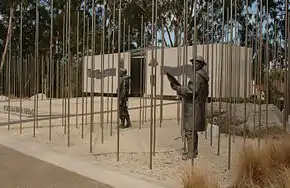 On both sides of the memorial are figures representing Australian soldiers, sailors and airmen who served in Korea. Battlefield boulders are set in fields of stainless steel poles which symbolise those who died.