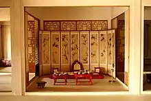 The sura (수라) were the main meals of the day. Breakfast was served at ten in the morning and the evening meals were served between six and seven at night. The set of three tables (surasang, 수라상), were usually set with two types of rice, two types of soup, two types of stew (jjigae), one dish of jjim (meat stew), one dish of jeongol (a casserole of meat and vegetables), three types of kimchi, three types of jang (장) and twelve side dishes, or called 12 cheop (12첩). The meals were set in the suragan (수라간), a room specifically used for taking meals, with the king seated to the east and the queen to the west. Each had their own set of tables and were attended by three palace servant women known as sura sanggung (수라상궁). These women would remove bowl covers and offer the foods to the king and queen after ensuring that the dishes were not poisoned.[6]