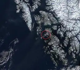The location of the long deserted village named Shakan is on the northwest coast of Kosciusko Island,[2] not on nearby Shakan Island.