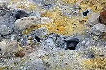 The Seltún [ˈsɛlˌtʰuːn] geothermal area is situated next to Krýsuvík in direction of lake Kleifarvatn (Route 42) and at the foot of Sveifluháls hyaloclastite ridge. It is a geothermal high temperature area,[8] hydrothermal alteration has led to a multicolored environment. Here solfataras, fumaroles, mudpots and hot springs are formed; the soil is coloured bright yellow, red, and green caused by iron oxidation, sulfur and calcite precipitation. The sulfur deposits were mined in 1722–1728 and in the 19th century. German scientist Robert Bunsen visited the site in 1845 and, based on research there, proposed a hypothesis on formation of sulfuric acid in nature.[15]