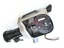 This camera had an internal cassette in the magazine, which could fit 100 ft (30 meters) of a 16 mm film spools. This way the film could be replaced without risking light leaks.