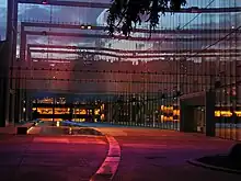 Kreielsheimer Promenade has been described by the Seattle Post-Intelligencer as "an appealing indoor garden on the ground level and a series of towering metal scrims overhead onto which fields of color [are] projected, primarily on performance nights".[5] The American Institute of Architects describes the promenade as a "subtly undulating, brightly lighted open space between two campus buildings".[6]