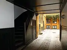 Kringlegangen is a passageway linking the square Gråbrødretorv with the street Valkendorfsgade in the Old Town of Copenhagen, Denmark. A bakery was operated on the site from before 1787 until at least the 1910s. The present building complex (Gråbrødretorv 17/ Valkendorfsgade 32) was constructed in 1856-1857 for master joiner Carl Heinrich Winther. The passageway was not opened to the public until 1975. The name Kringlegangen was inspired by a gilded kringle above the entrance from Gråbrødretorv as well as to the twisting and turning course of the passageway. The entire building complex was listed in the Danish registry of protected buildings and places in 1945.