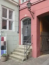 Valkendorfsgade is set back from the street compared to the adjacent building at No 30. Two of its five bays are hidden by the perpendicular building at No. 34, leaving it with only three bays visible from the street. The plastered facade is finished with a belt course above the ground floor, sill courses below the windows on the ipper floors and a cornice. The gateway is located in the right-hand-side of the building. The main entrance to the left of it is accessed via a staircase with five steps.[34]