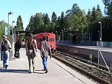 Kringsjå is a rapid transit station situated on the Sognsvann Line, 8.4 kilometers (5.2 mi) from Stortinget in the city center.[10] It is open ground station featuring two side platforms. The station meets the metro standard of the Oslo Metro. This includes two 120-meter (390 ft) side platforms and an overpass. The station is designed by Arne Henriksen and features a small steel and glued laminated timber roof on each platform. It has a similar design to most of the other stations on the line.[11]