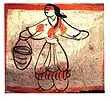 In this period, the kun developed into new styles of Chinese trousers, such as dashao (Chinese: 大袑) which were trousers with extremely wide legs and the dakouku (Chinese: 大口褲), which was a type of trousers which were tied with strings under the knees in this period.[3] The kun however was rarely used by the general population and were only used by warriors and servants during this period as the members of the high society were still deeply influenced by the traditional etiquette of the Han culture and found the kun disgraceful for allowing the exposure of its wearer's leg shape; moreover, people had difficulty adjusting to the use of the kun in their everyday lifestyle and routines as they were used to their traditional ku.[3] In the chapter Jijiupian《急就篇》by Shi You during the Western Han dynasty, the zheku (Chinese: 褶袴) consisted of the zhekukun (Chinese: 褶袴褌), a wide-legged kun which were bound with strings at the around the knees, and was worn with a tight knee-length chanyu (Chinese: 襜褕) robe.[3][15]