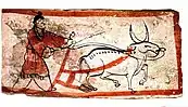 The ku was worn in China since the neolithic times, where it was called jingyi (simplified Chinese: 胫衣; traditional Chinese: 脛衣; lit. 'shin clothing').[3] The jingyi was the earliest form of in China and only covered the shank of its wearer.[13] The jingyi consisted of two separated legs which were tied on calves and allowed to exposure of the thighs.[3] As a result, a wrap-skirt had to be worn to hide the lower body and the crotch area.[3] The jingyi was also used to protect its wearer from the cold and to protect its wearer's skin.[3] In the Spring and Autumn period, trousers without crotches were still in use.[1]