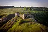 The ruined Kudryntsi Castle (Ukrainian: Кудринецький замок, Kudrynets'kyi zamok, Polish: Zamek w Kudryńcach) is perched on a hilltop overlooking the Zbruch River in Chortkiv Raion, Ternopil Oblast, Ukraine, 25 km west of a larger fortress in Kamianets-Podilskyi. It was built in the early 17th century by Jan Szczęsny Herburt and throughout the ensuing century was subjected to repeated sieges by the Cossacks and the Turks. By the 19th century, some portions of the walls had crumbled away, and the structure was left to its fate.