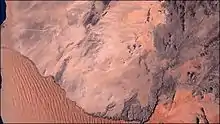 Between Naukluft and Namib the Kuiseb carved out a canyon in a barren and inaccessible area. During World War II the area around the Kuiseb Canyon served as a shelter for Henno Martin and Hermann Korn who moved there to wait the war out.[7] Two books and a film were subsequently published about this 2-year stay; the ruins of their shelter can be visited. On its course through the Namib the Kuiseb is bordered on one side by some of the tallest sand dunes in the world, and on the other by barren rock.[3] The red sand dunes south of the river reach heights over 150 meters. The prevailing winds blow the dunes northward, but their movement is blocked by the river. In the process, so much sand and silt is deposited in the Kuiseb that it only reaches the sea while it is in flood.[8]