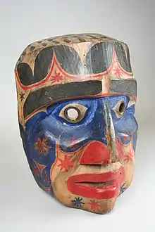 Masks of Kumugwe often show him with sea creature attributes, such as rounded fish eyes, rows of gills at the corners of his mouth, fins encircling his head, the suction cups of an octopus, and fish and aquatic birds which frame or sit upon his head. His most important totemic animals are loons, seals, sea lions, octopuses, orcas, and sculpins.