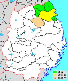 colored area=original extent in Meiji period; green=present area (1=Karumai; 2=Noda; 3=Kunohe; 4=Hirono)