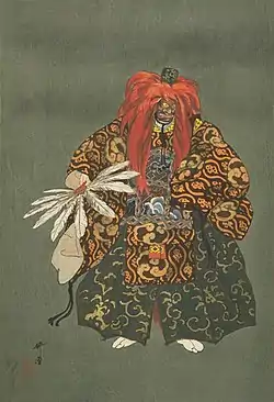 The play begins with a cherry blossom viewing expedition involving monks and children from Kurama temple.[1] On being joined by a rough Yamabushi - an ascetic mountain priest - the party leaves in protest, with the exception of one child, who reveals himself as the young Yoshitsune, isolated at the temple both as an orphaned son and as the only child from the (eclipsed) Genji clan.[2] The stranger reveals himself in turn as the head Tengu, or long-nosed goblin; and he proceeds to instruct the young hero in the martial arts, with a view to him avenging his slaughtered father's death.[3]