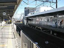 The station has two side platforms. The station building is located on the north side of the Shin-Shimizu direction platform, and it had automated ticket machines, and automated turnstiles, which accept the LuLuCa smart card ticketing system as well as the PiTaPa and ICOCA IC cards. The station is wheelchair accessible.