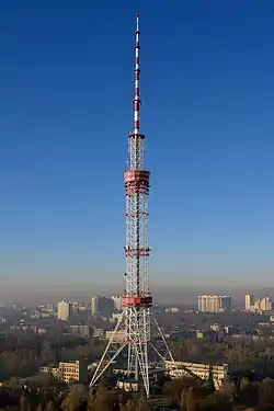 The Kyiv TV Tower (Ukrainian: Телевізійна вежа, romanized: Televiziyna vezha) is a 385 m-high (1,263 ft) lattice metal tower[1] on Oranzhereina Street, Kyiv, Ukraine, and is the tallest structure in the country.[2] The tower was built in 1973 while Kyiv was the capital of Ukrainian SSR.[3] The tower was the tallest freestanding metal structure in the world[1][2] It is used for radio and television broadcasting and is not open to the public.[1] It is the tallest lattice tower in the world and sixth tallest structure in Europe.