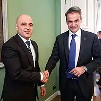 Kyriakos Mitsotakis (Greek: Κυριάκος Μητσοτάκης, Kyriákos Mitsotákis [ciɾˈʝako̞s̠ mit͡so̞ˈtacis̠]; born 4 March 1968) is a Greek politician who has been prime minister of Greece since June 2023 and before from July 2019 to May 2023. He is president of the New Democracy party since 2016. On 26 June 2023, Mitsotakis won a second term as prime minister after winning the June 2023 Greek legislative election.[1] Mitsotakis previously was Leader of the Opposition from 2016 to 2019, and Minister of Administrative Reform from 2013 to 2015. He is the son of the late Konstantinos Mitsotakis, who was Prime Minister of Greece from 1990 to 1993. He was first elected to the Hellenic Parliament for the Athens B constituency in 2004. After New Democracy suffered two election defeats in 2015, he was elected the party's leader in January 2016. Three years later, he led his party to a majority in the 2019 Greek legislative election.