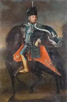 Ladislas Ignace de Bercheny was born in 1689, the son of Hungarian noble Miklós Bercsényi who was a friend of Francis II Rákóczi. Bercheny started his military career in the Bodyguard of prince Rákóczi. After the Prince's failure to achieve Hungarian independence in 1711, Bercheny emigrated to France. In 1712, he was named lieutenant-colonel in the Rattky Hussards Regiment, then the only hussar regiment in the French Army. After a year spent at Rákóczi's court-in-exile in Constantinople, Bercheny was promoted mestre de camp (colonel) in the Rattky Regiment in 1719.[1]