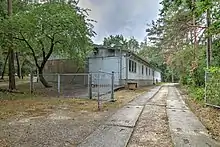 Since the facility was built under strict secrecy, no civilian employees were allowed on the site. The only exception was for the construction of two wells in the inner zone, which were drilled by a civilian company before the bunker was built in 1968, since the Stasi did not have the necessary specialists.[8] All other work was done by the Stasi employees themselves. For this purpose the complex contained a carpentry shop[9] and an electrical workshop,[10] and there was a locksmith's in the main building.[11] These outbuildings, along with a garage complex[12] and a dog kennel,[13] served to camouflage the bunker, which had no outer zone to the west to hide it. In addition, privacy fencing was placed at the west entrance of the "legending hall".[14] The main function of this building was to camouflage the bunker from western satellite reconnaissance. It was also used to store mobilization reserves.[11] Both entrances to the building were secured by a guard dog on a dog run.[15][5][6]