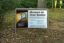 "Neues Besucherzentrum am Stasi-Bunker Machern eröffnet". Mitteldeutscher Rundfunk. January 10, 2020. Archived from the original on January 11, 2020. Retrieved January 1, 2022.