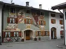 Lüftlmalerei is a popular, folk-oriented variation of trompe-l'œil from the Baroque and imitates architectural elements. As in 'high architecture' it also embeds pictorial cartouches, mirrors and fields. Its subject matter ranges from the patron saints of houses or house emblems to representations of Biblical stories and the classical motifs of peasant art from everyday rural life to hunting. Banners with mottos are common and the sundial is also a popular element.