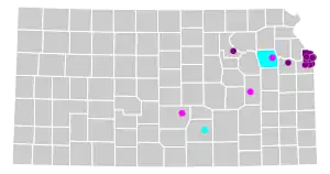 Other cities, including the capital city of Topeka, Emporia and Hutchinson, prohibit discrimination against city employees on account of their sexual orientation and gender identity. Likewise, the county of Shawnee,[29] and the city of Wichita prohibit discrimination against city/county employees but on the basis of sexual orientation only.[30]